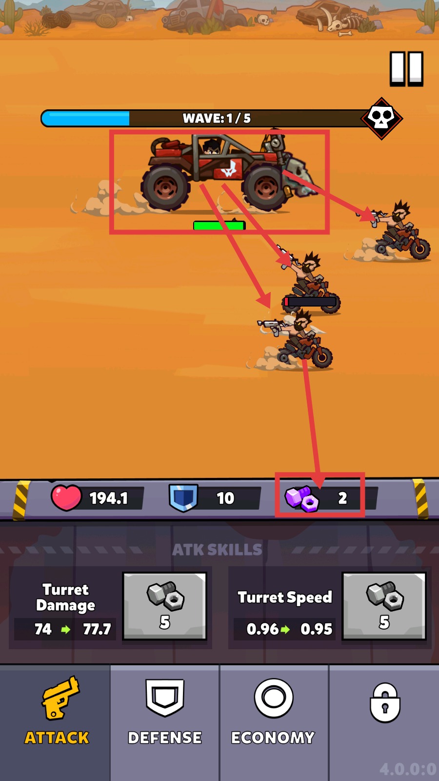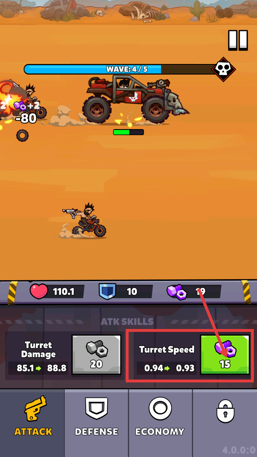 3、推进到【WAVE:4/5】阶段,消耗紫色零件升级【Turret-Speed】,提升炮塔攻击速度,强化作战能力。