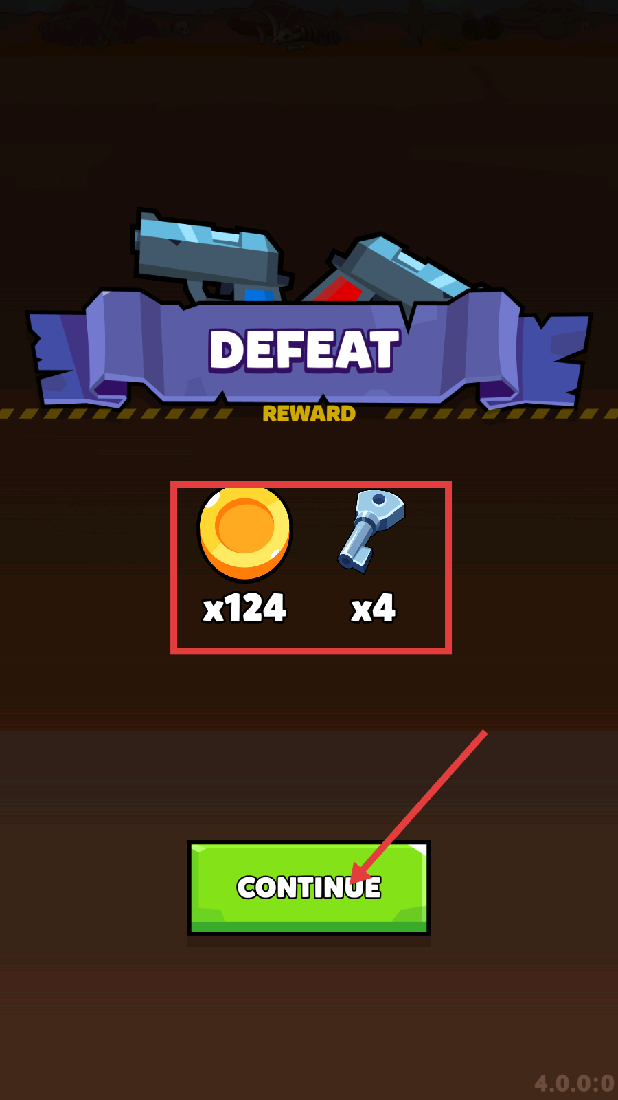 4、即便战斗失败,也能获得【金币-x124】和【钥匙-x4】的奖励,点击【CONTINUE】继续游戏,积累资源再战。