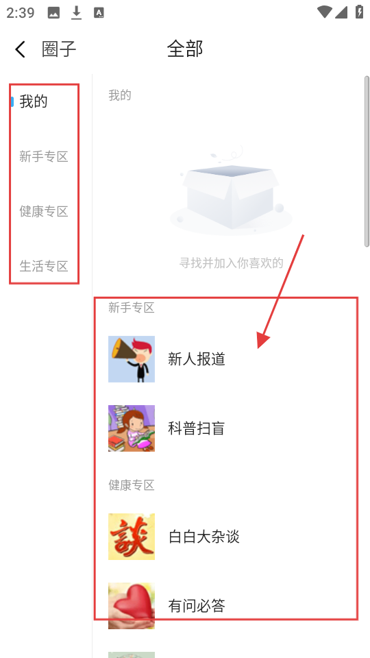 1、在首页,点右上角图标,进入圈子页面,可查看各专区及相关内容。