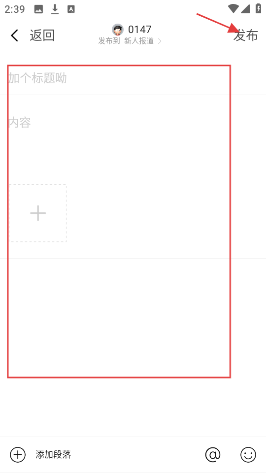 3、在发布页面,填标题、内容,可添加段落等,完成后点【发布】,提交内容。