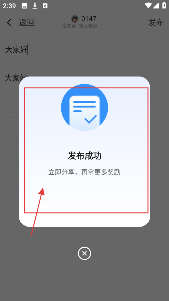 4、发布成功后,会有提示弹窗,可选择立即分享,还能获取更多奖励。