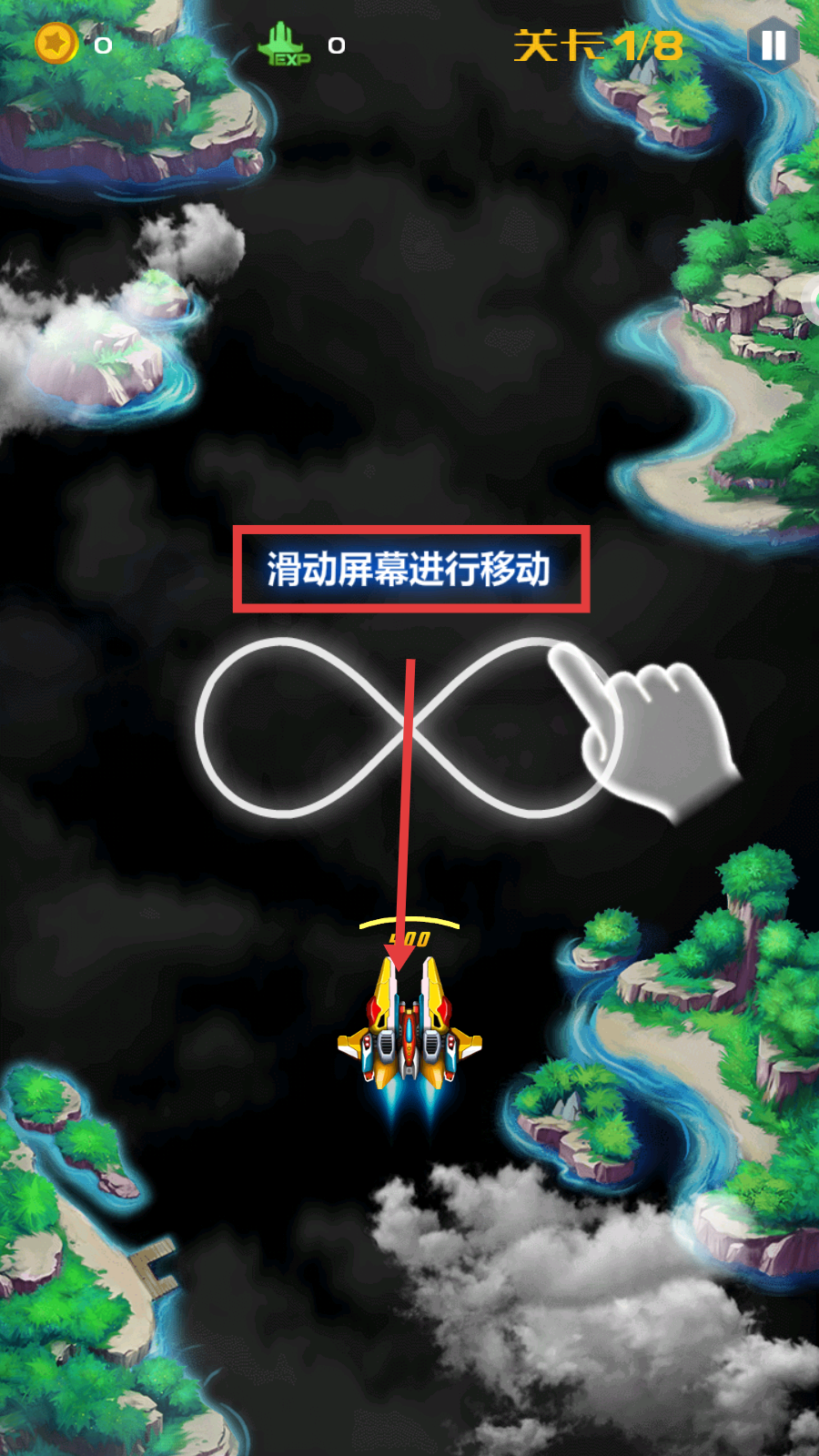 1、进入【关卡1/8】,按照提示【滑动屏幕进行移动】,操控战机开启飞行冒险。