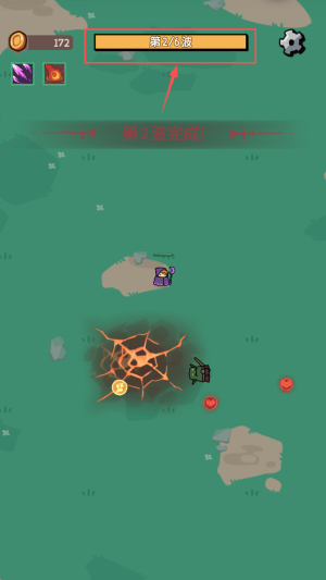 3、如何进入下一波?第2/6波倒计时结束自动开始,击杀全部敌人即显示“第2波完成!”。