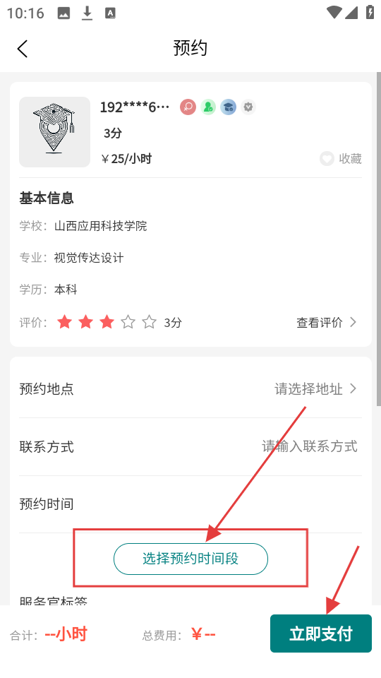 3、在预约页,填基本信息后,点【选择预约时间段】,选合适时间段,再点立即支付。
