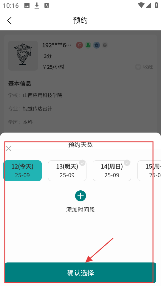 4、选好预约天数,如13(明天)-25-09,点【确认选择】,完成预约时间的确定。