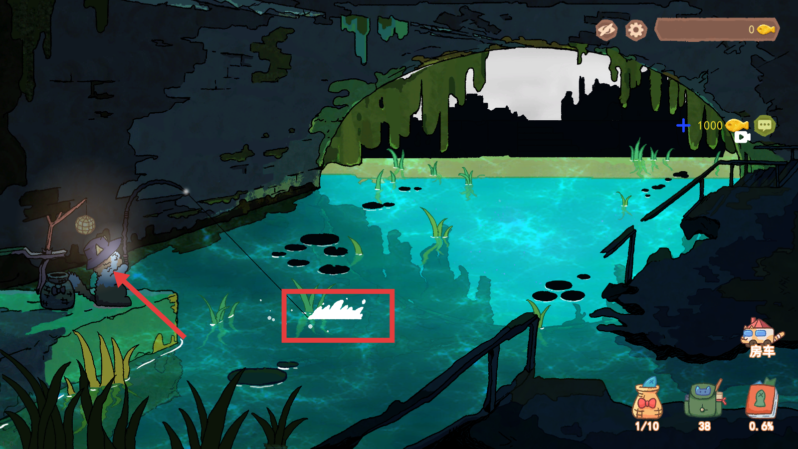 1、点击【开始游戏】,进入洞穴水域的钓鱼场景,开启捕鱼冒险之旅。