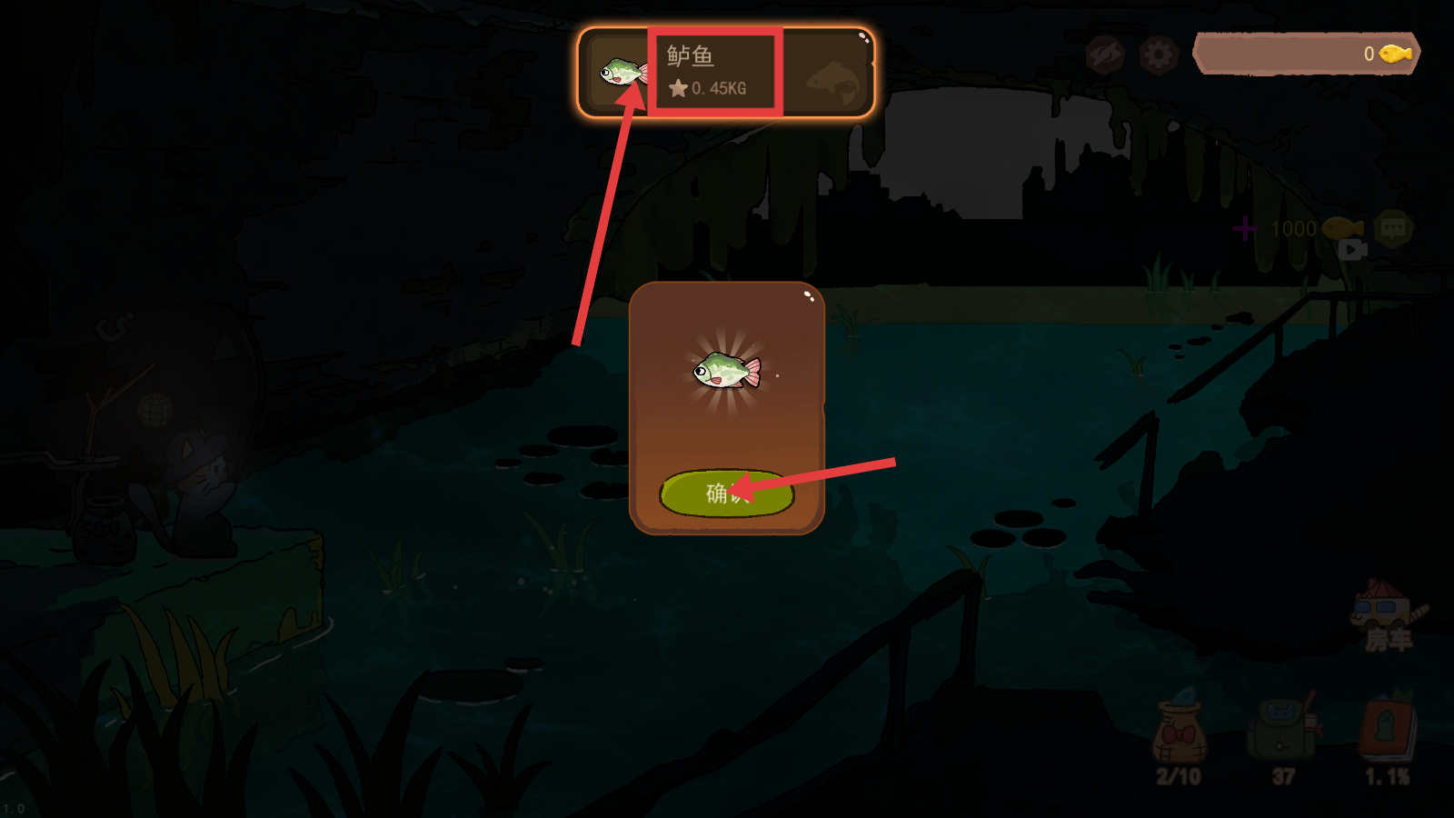 3、成功钓到【鲈鱼-0.45KG】后,点击绿色的【确认】按钮,记录所获鱼类资源。