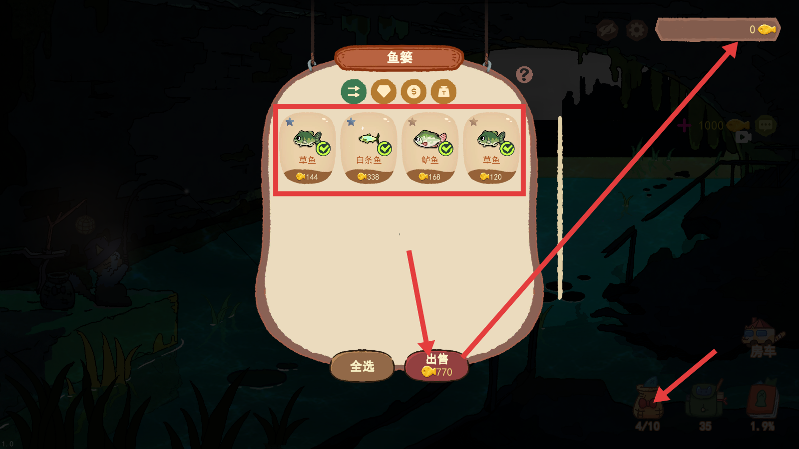 4、进入【鱼篓】界面,查看钓到的草鱼、白条鱼、鲈鱼等,点击【出售】按钮,可卖出鱼类获取金币。