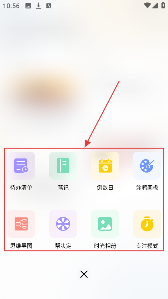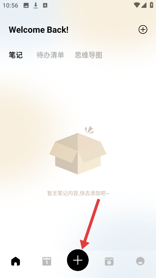 1、在首页,点底部【+】号,弹出功能选择页面,可选择待办清单、笔记等功能。