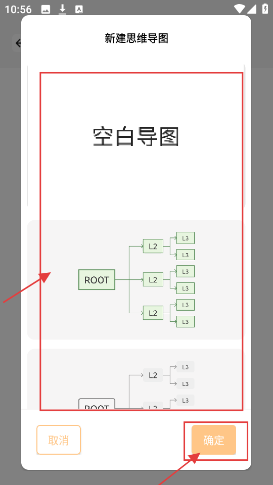 3、在新建思维导图页,选导图模版,点【确定】,进入思维导图编辑页面。