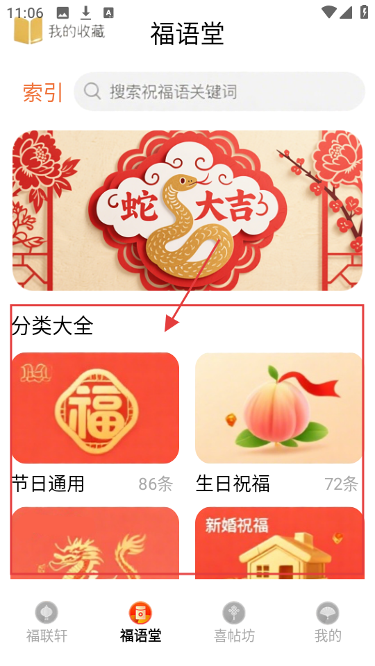 4、到福语堂界面,从分类大全里选【节日通用】这类,就能看到对应的祝福语啦。