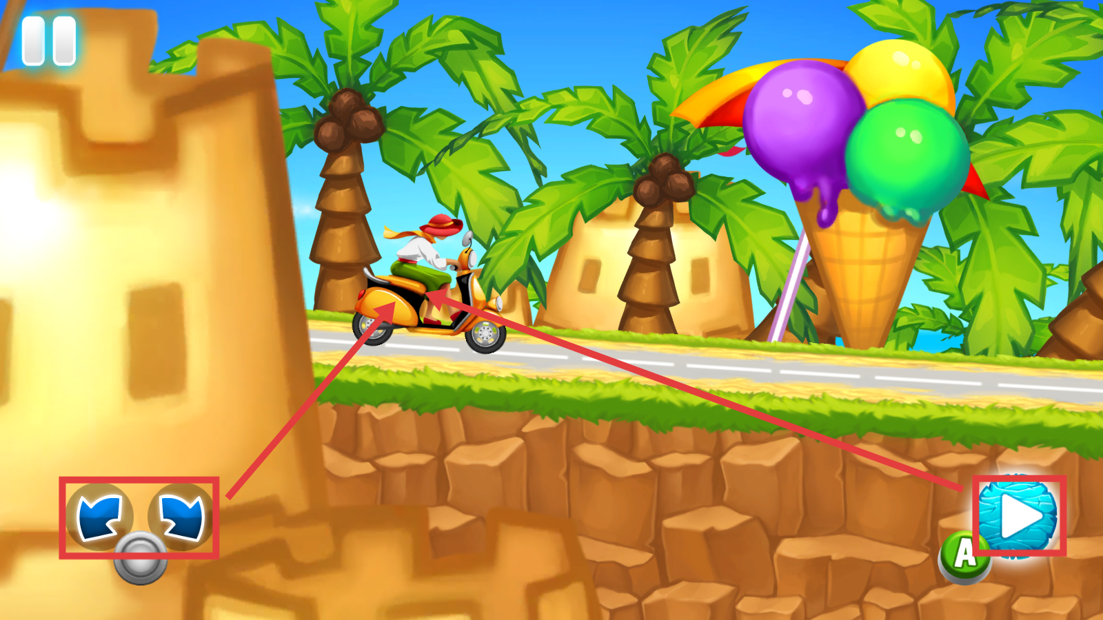 2、在第3关中,使用左侧左右箭头按钮操控摩托车移动,点击右侧蓝色播放按钮可控制行驶节奏,在道路上平稳驾驶。