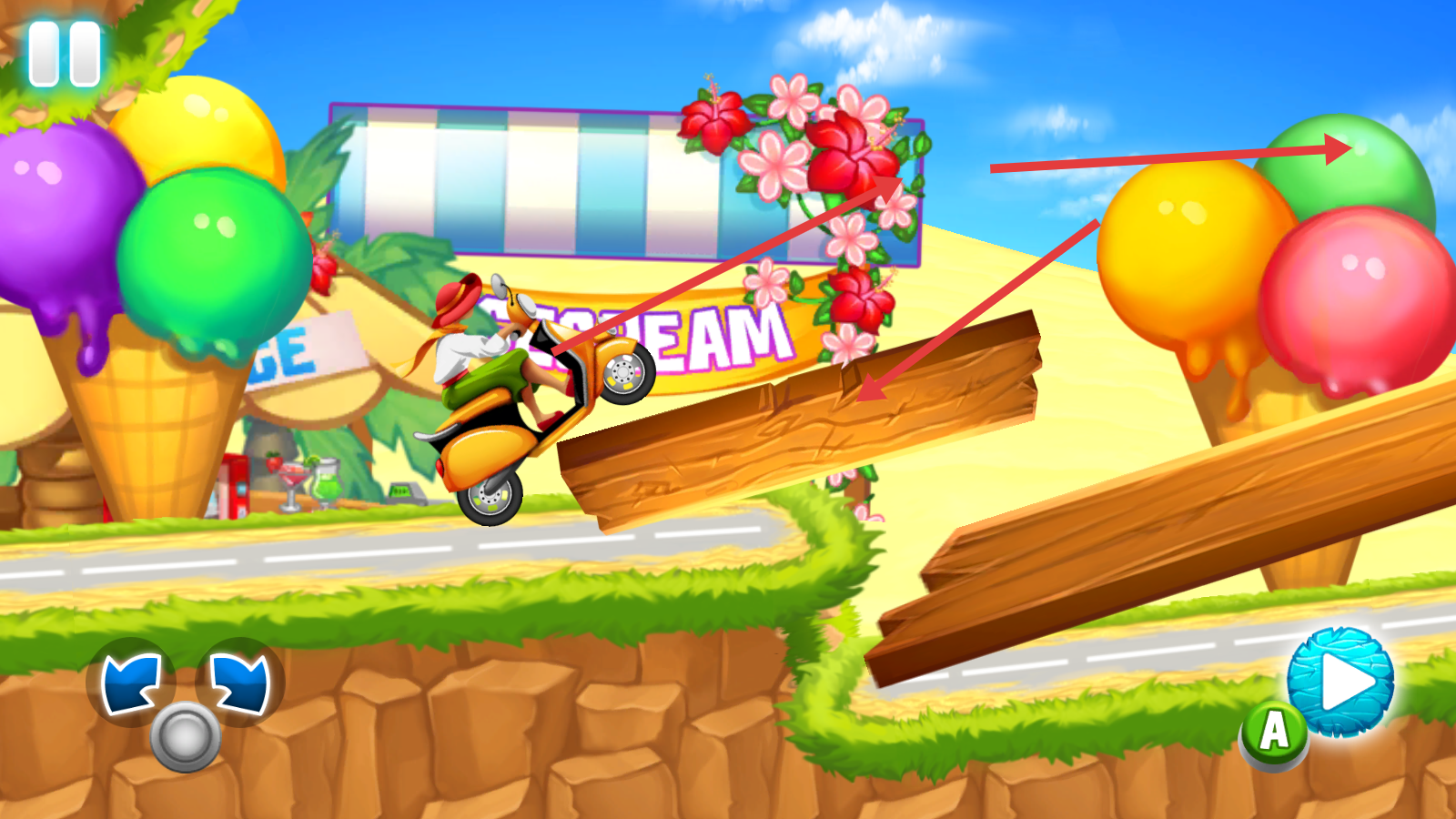 3、驾驶摩托车时,留意木桥、花朵装饰等场景元素,小心通过不同地形,确保摩托车顺利前进。