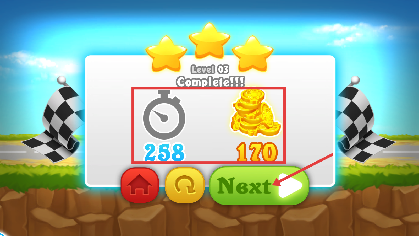 4、成功完成第3关后,会获得三星评价,还能得到【258】时间记录和【170】金币奖励,点击绿色【Next】按钮可进入下一关。