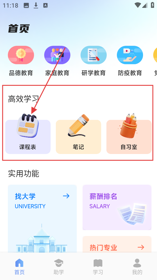 1、打开应用,在首页“高效学习”区域,选【课程表】,就能进入课程表页面啦。