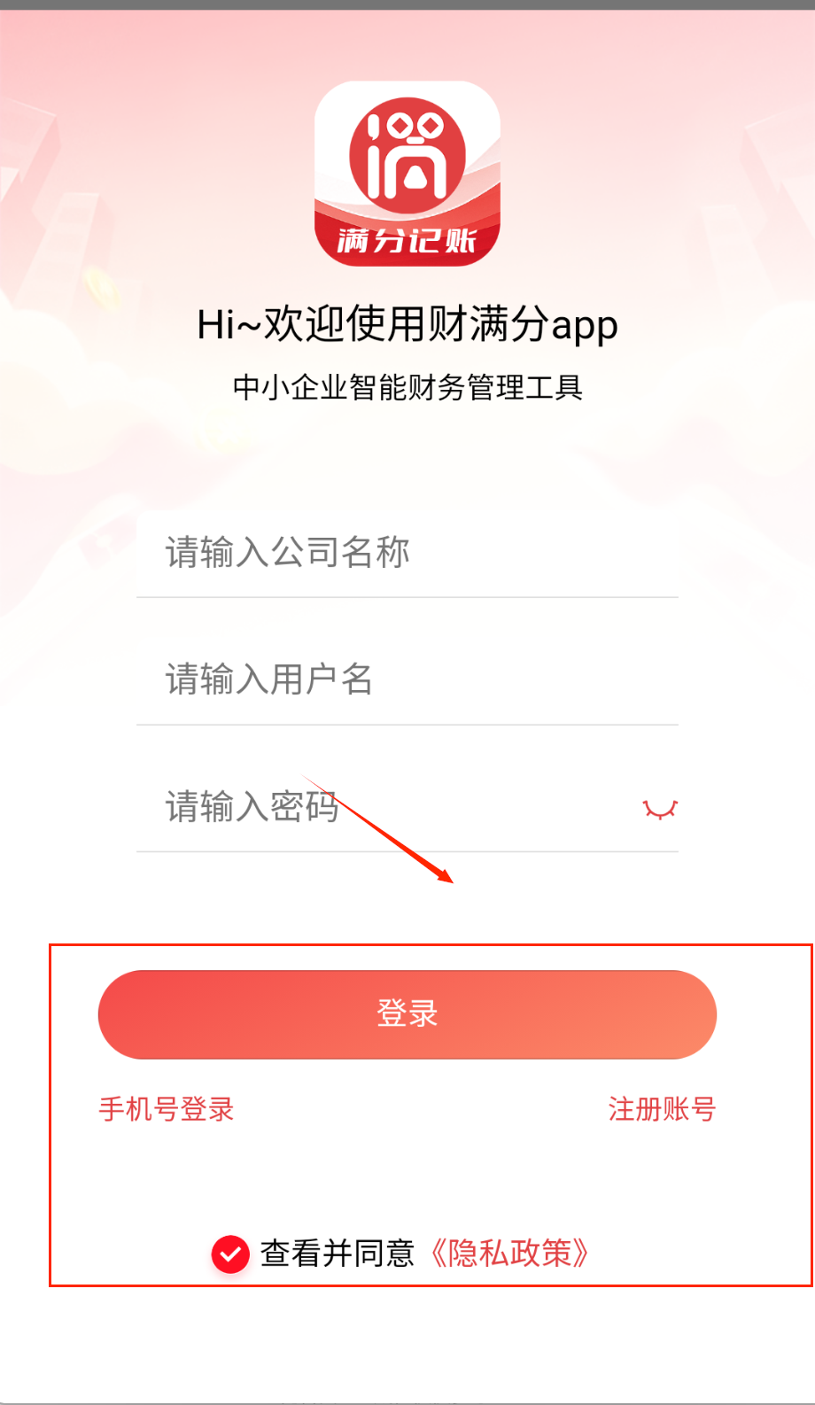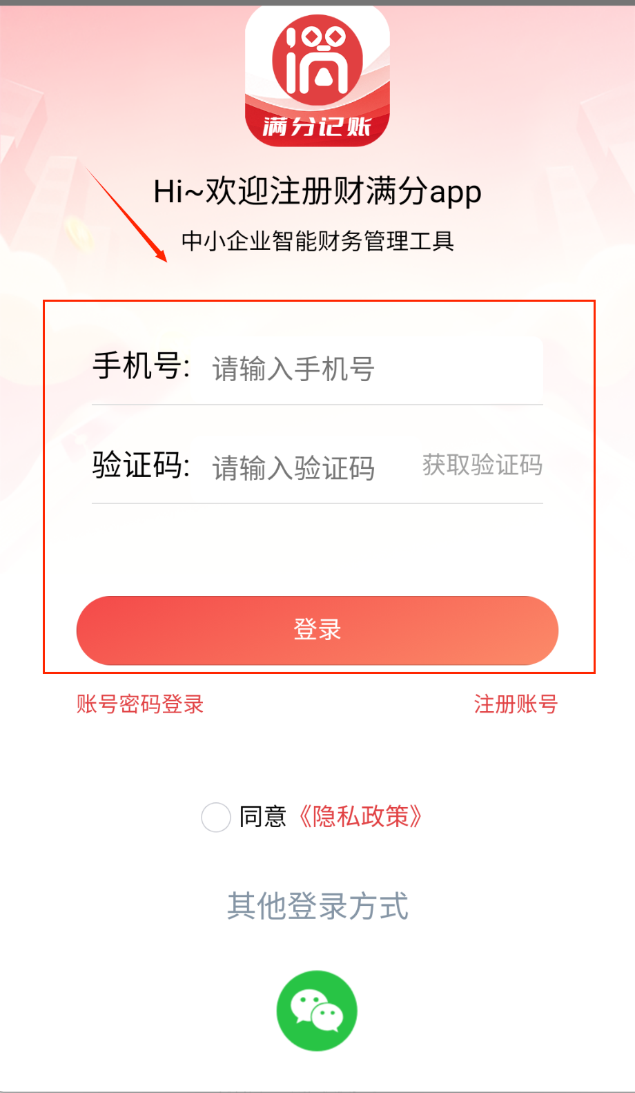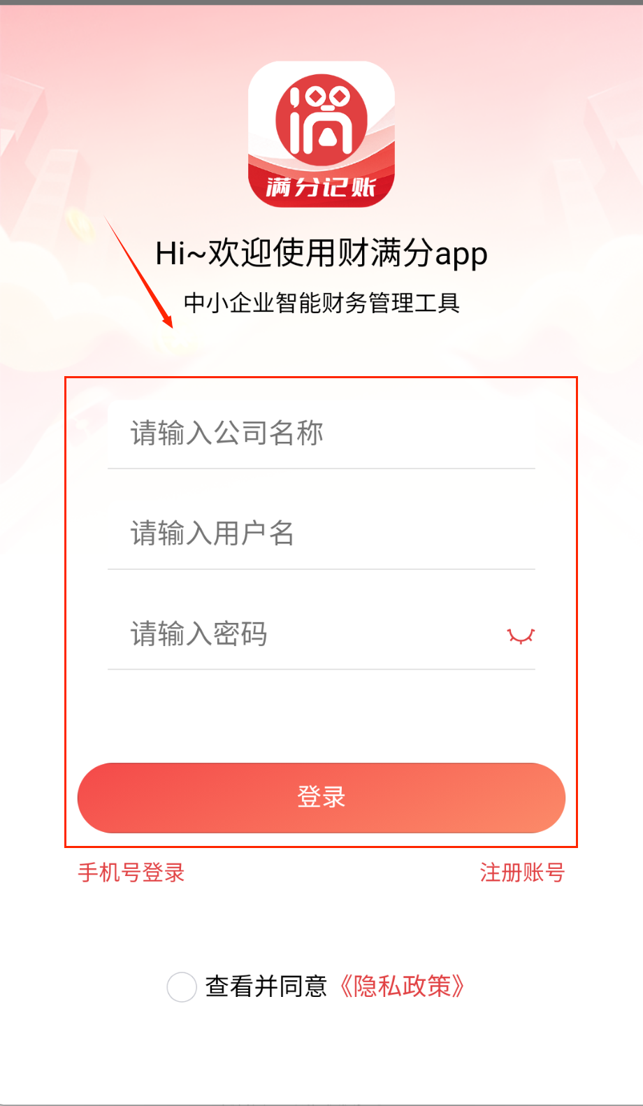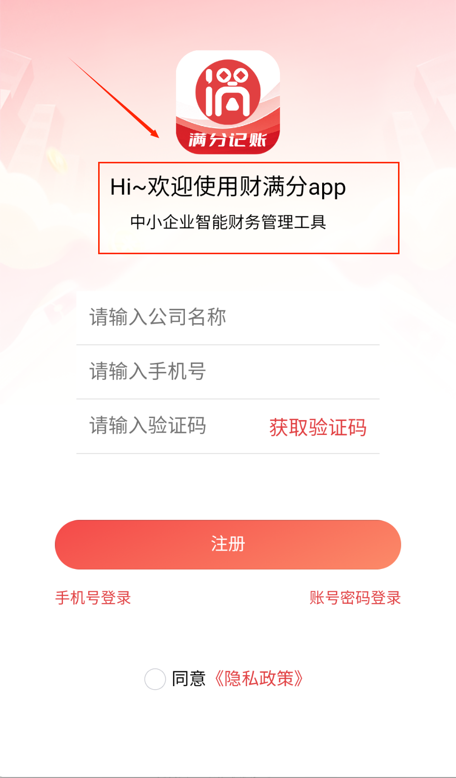 1、 打开财满分APP就能看到粉色背景的登录界面啦,顶部有红白配色的“满分记账”图标,中间写着“Hi~欢迎使用财满分app”。
