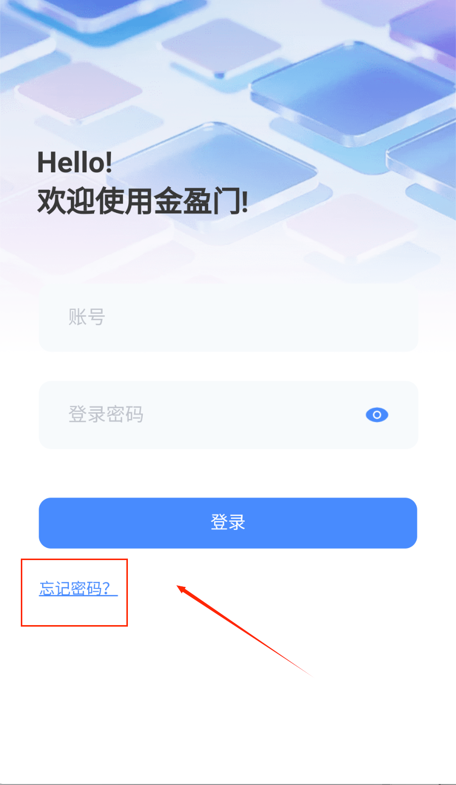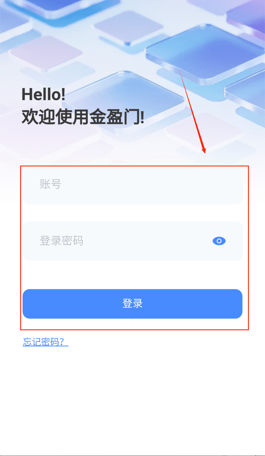 1、 打开金盈门APP后,你会看到蓝紫色渐变背景的登录界面,顶部显示着当前时间(比如10:33),在"账号"框里输入你的用户名或手机号。