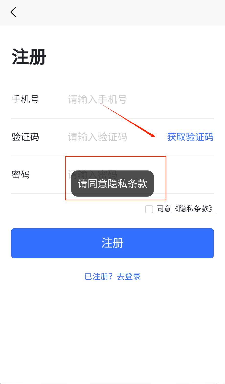 2、 注册时别忘了看下面那个“请同意隐私条款”的提示,找到那个小方框勾选上,它旁边写着“同意《隐私条款》”,不勾选可注册不了哦。