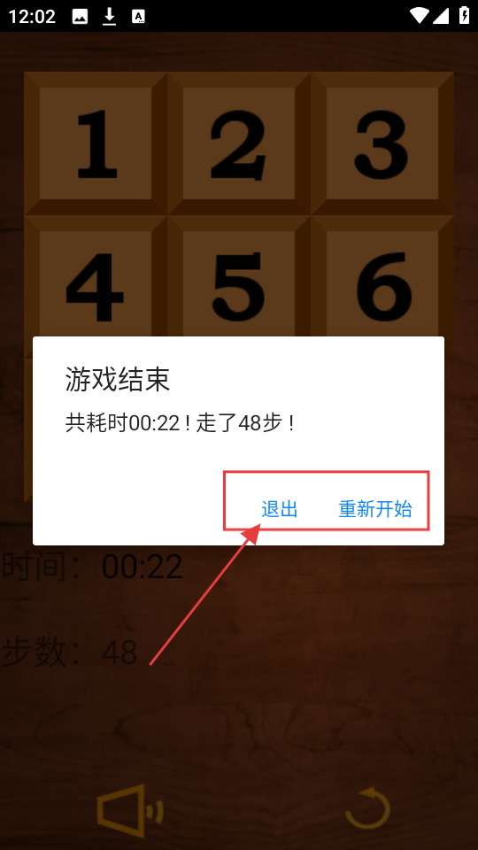 4、游戏结束后,会显示耗时和步数,若想退出,点击【退出】即可;想重玩,点【重新开始】。