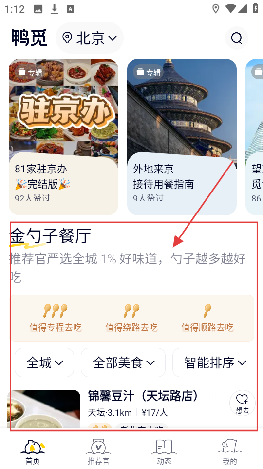 1、在首页,能看到“金勺子餐厅”相关推荐,可依据“值得专程去吃”等标签选美食,还能筛选范围、品类与排序方式。