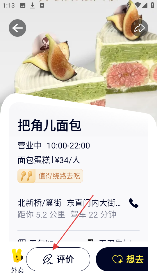 2、进入“把角儿面包”店铺页面,若要评价,点击【评价】按钮,就能开启评价操作。