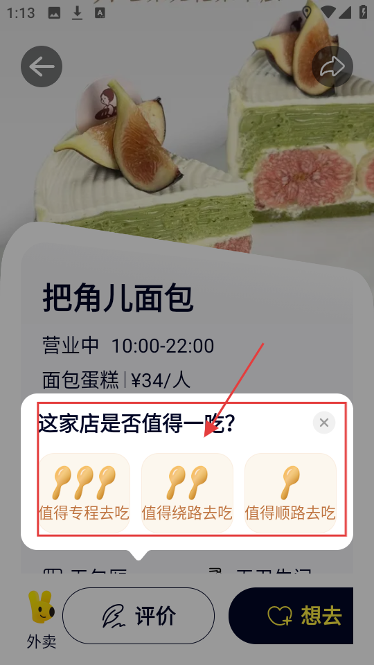 3、点击评价后,会弹出“这家店是否值得一吃?”的选项,可选择“值得专程去吃”等标签表达看法。