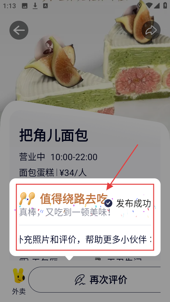 4、选好“值得绕路去吃”这类评价标签,还能补充文字评价,发布后会提示“发布成功”,助力其他小伙伴参考。