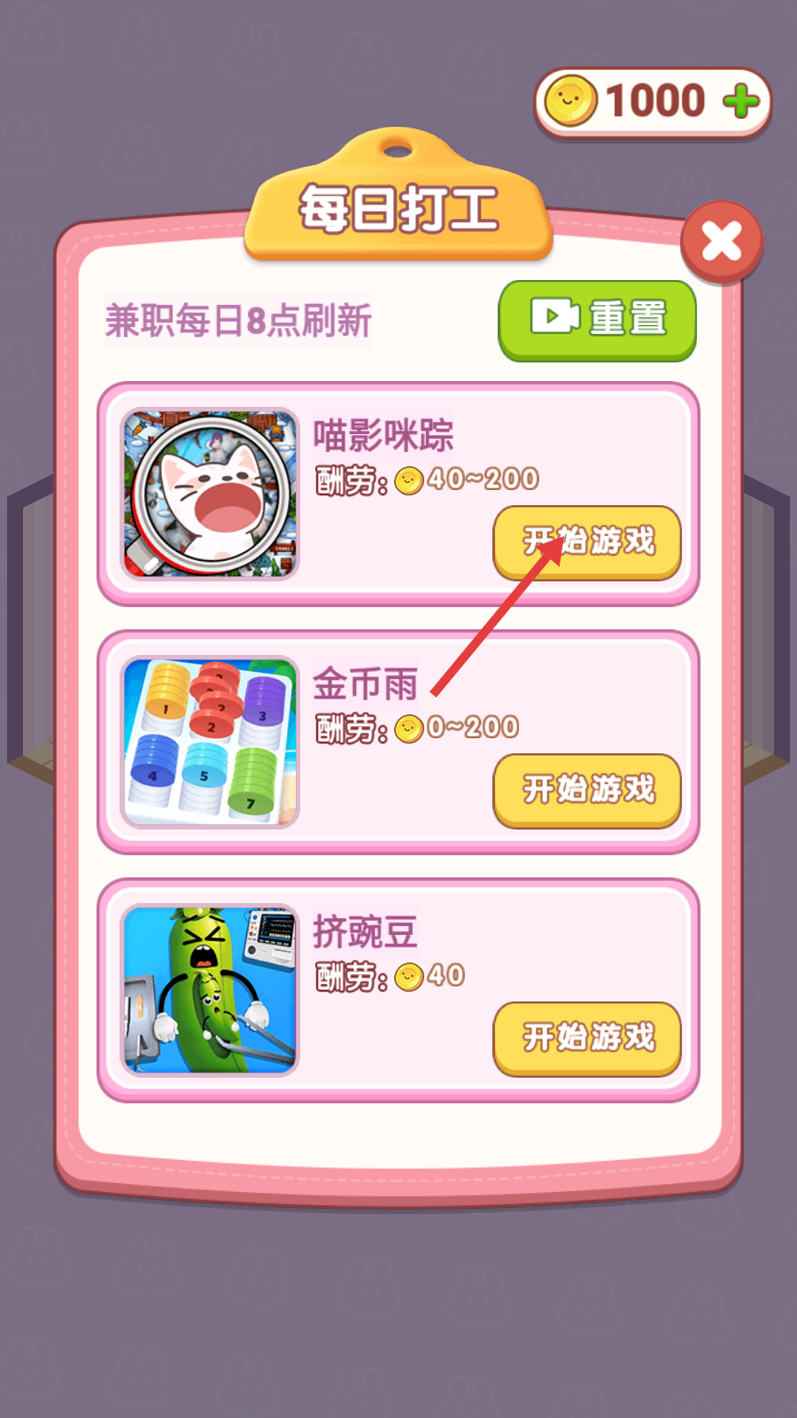 1、在【每日打工】界面,选择【喵影咪踪】等兼职,点击“开始游戏”即可参与,兼职每日8点刷新。