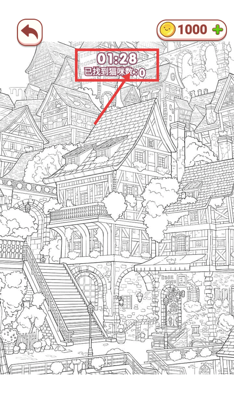 2、进入【喵影咪踪】后,有1:28的计时,需在场景里找猫咪,初始已找到猫咪数为0。