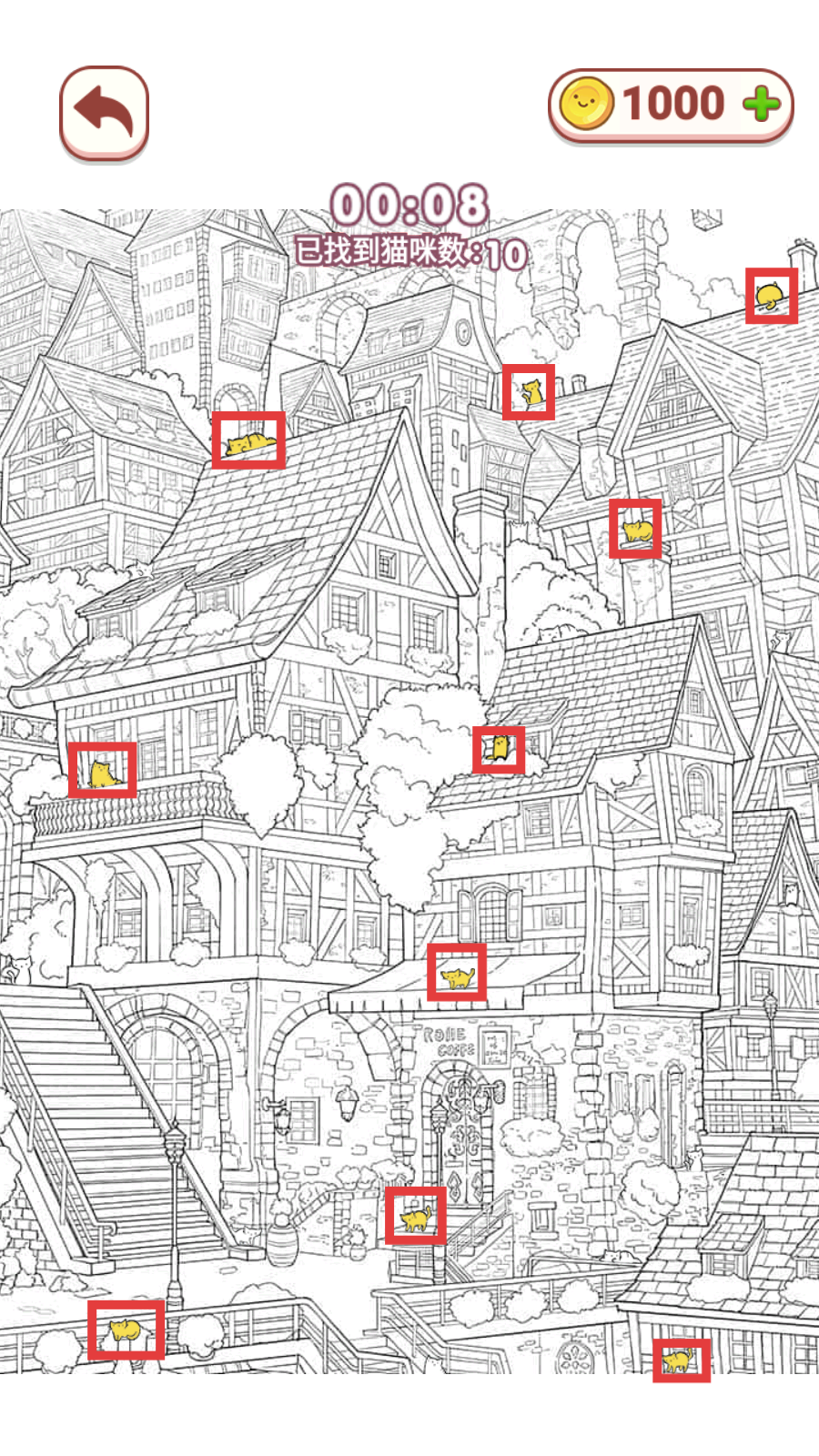 3、游玩时快速搜寻画面中的黄色猫咪,尽可能多找,能让已找到猫咪数增加,如图中可找到10只。