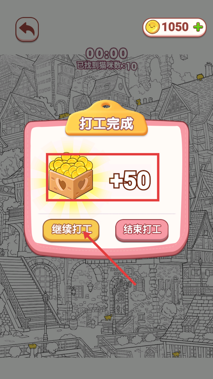 4、时间结束后打工完成,会获得金币奖励,如+50金币,还能选择“继续打工”或“结束打工”。