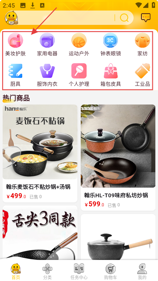 1、首页有【美妆护肤】【家用电器】等分类,可先选分类,再从热门商品里挑感兴趣的,开启购物。