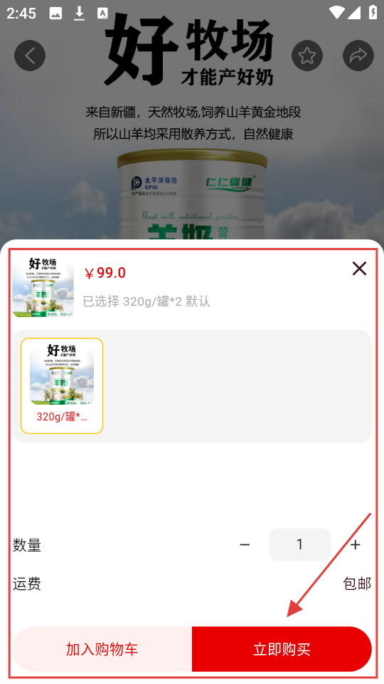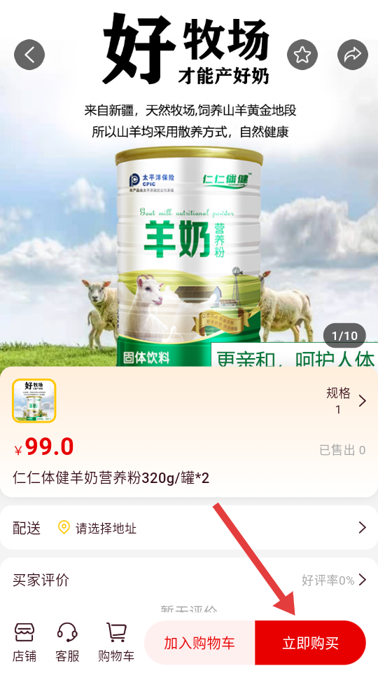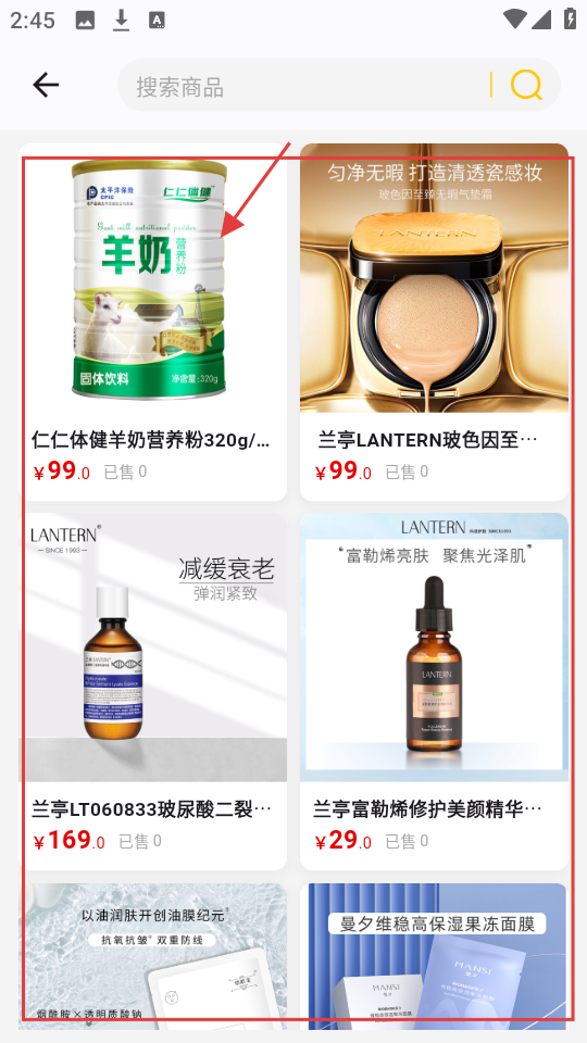 2、进入对应分类后,能看到各类商品,像羊奶营养粉、气垫霜等,点击喜欢的商品查看详情。