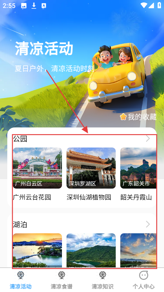 1、在【清凉活动】页面,有【公园】【湖泊】等分类,可根据喜好选分类,再挑想去的地方。