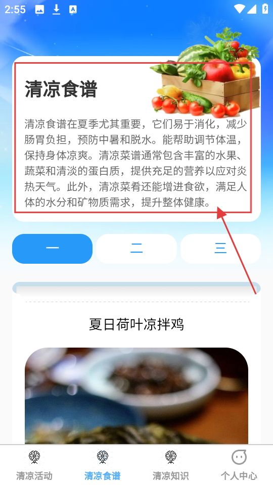 4、切换到【清凉食谱】页面,能了解清凉食谱的重要性,还能查看具体菜品,学做夏日美食。