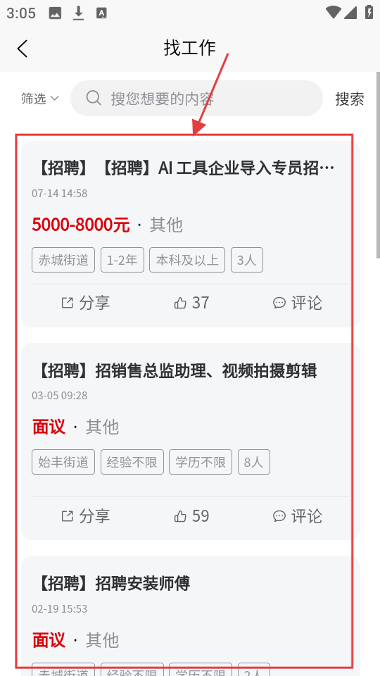 2、进入【找工作】页面,能看到很多招聘信息,像AI工具企业导入专员、销售总监助理等岗位,可挑选感兴趣的。