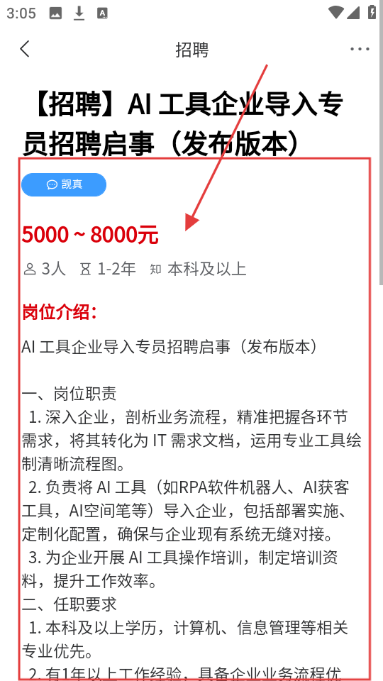 3、点开具体招聘信息,如【AI工具企业导入专员招聘启事】,能查看薪资、岗位介绍、任职要求等详细内容。