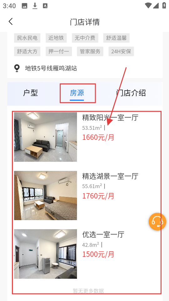 3、切换到【房源】栏,有一室一厅等户型,查看面积、租金,找到心仪房源。