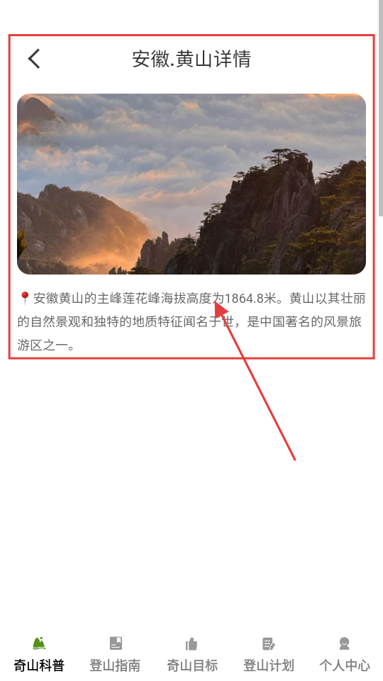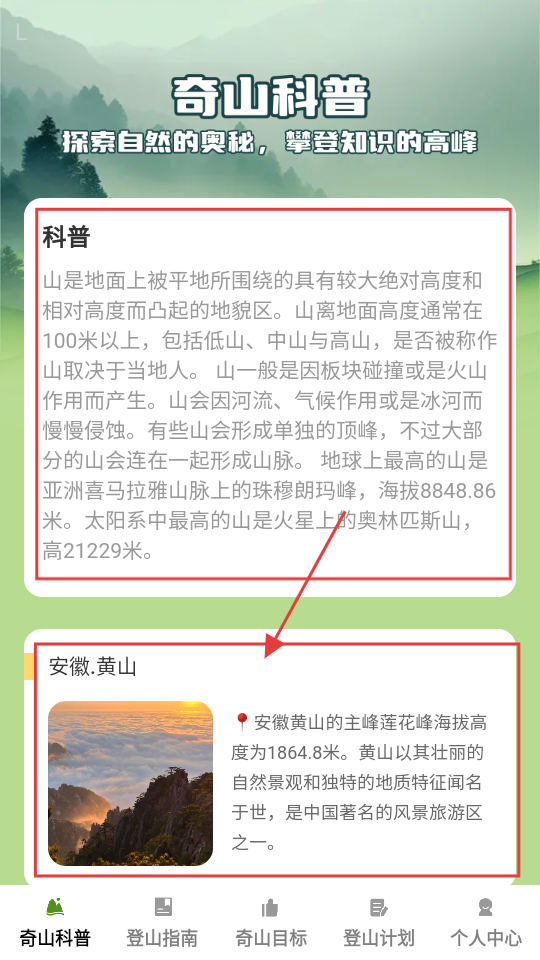 1、在【奇山科普】页,能了解山的科普知识,还可查看安徽黄山等名山介绍,先涨知识再规划登山。