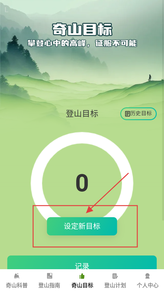 3、到【奇山目标】页,若要开启登山挑战,点击【设定新目标】,开始制定登山目标。