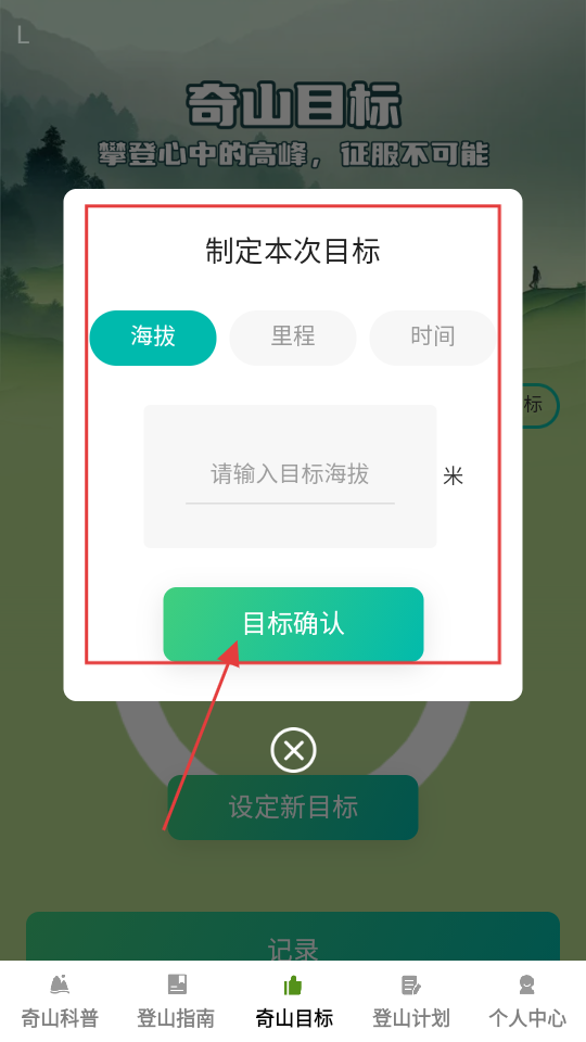 4、制定目标时,选择【海拔】等类别,输入目标海拔,点击【目标确认】,完成登山目标设定。