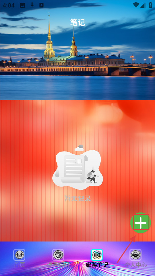 3、到【旅游笔记】页,若要记录旅游心得,点击右下角绿色加号,开始创建新笔记。