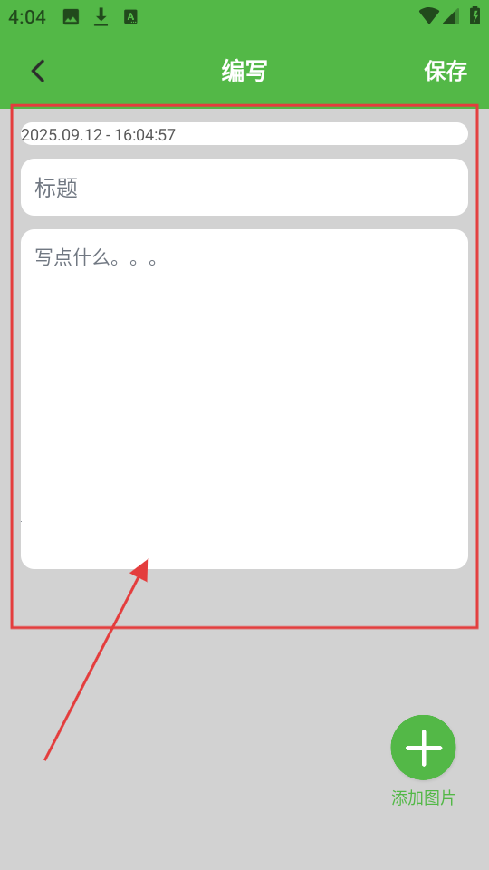 4、进入笔记编写页,可填写标题、内容,记录旅游点滴,写完还能保存,方便后续查看。