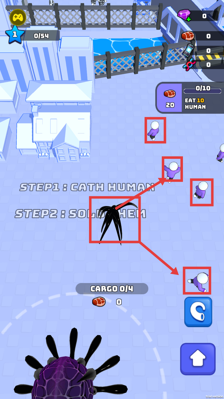1、操控黑色触手状角色捕捉紫色衣服的人类,推进【EAT-10-HUMAN】任务进度。