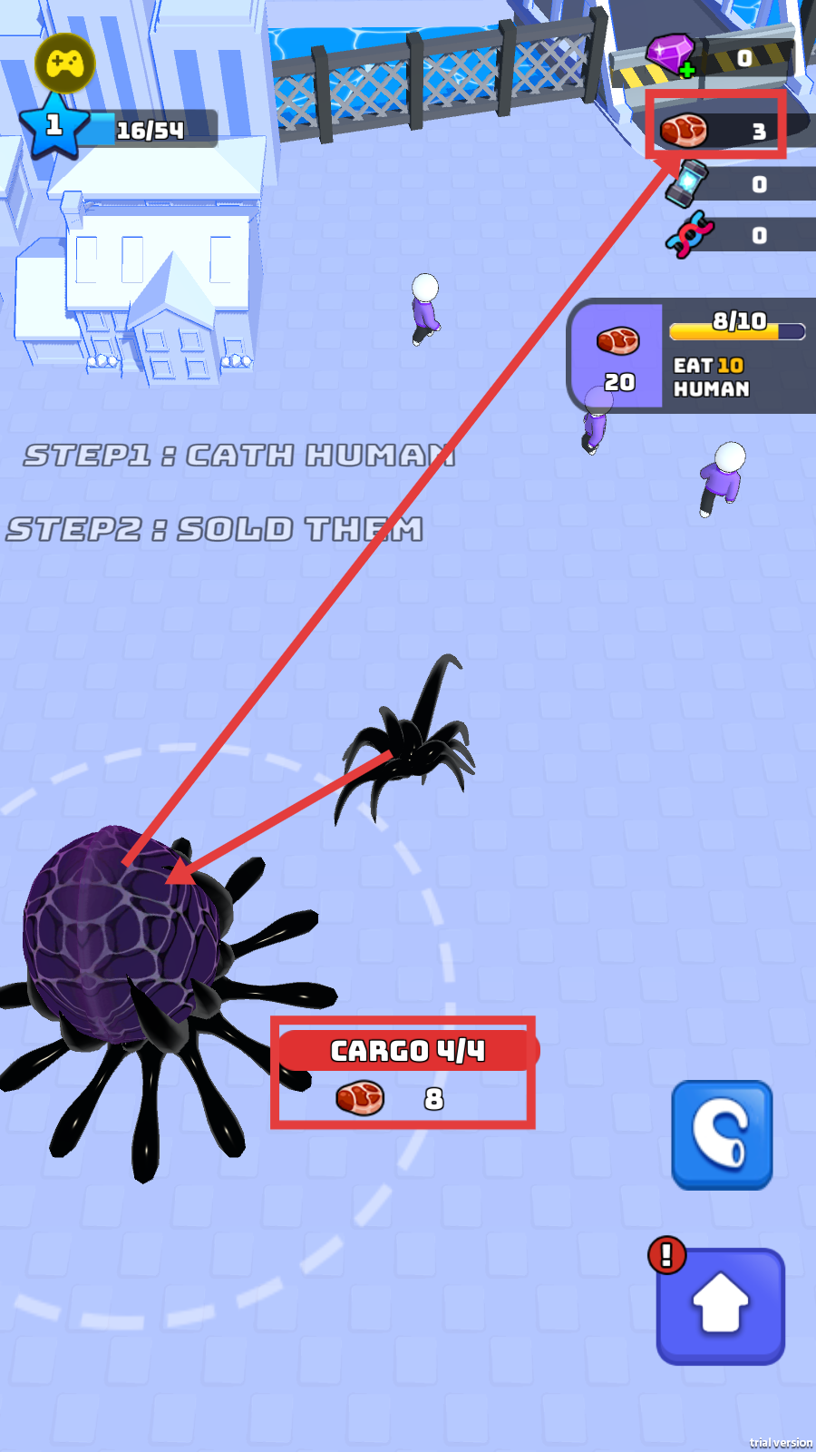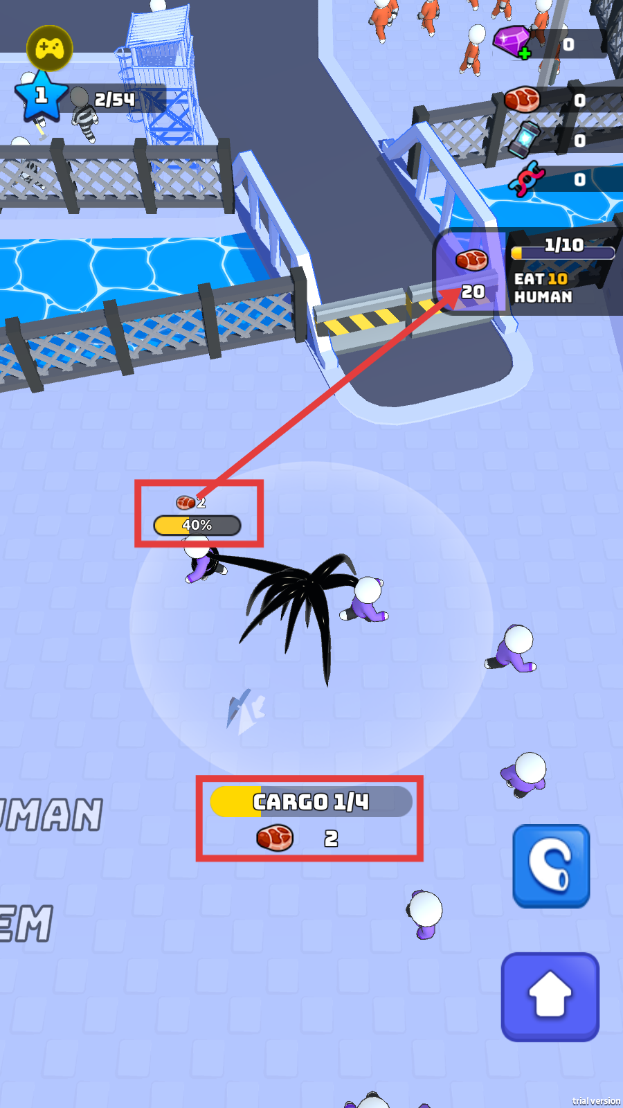 2、成功捕捉人类后会转化为肉块,积累货物,留意【CARGO】进度,同时【EAT-10-HUMAN】任务也会推进。