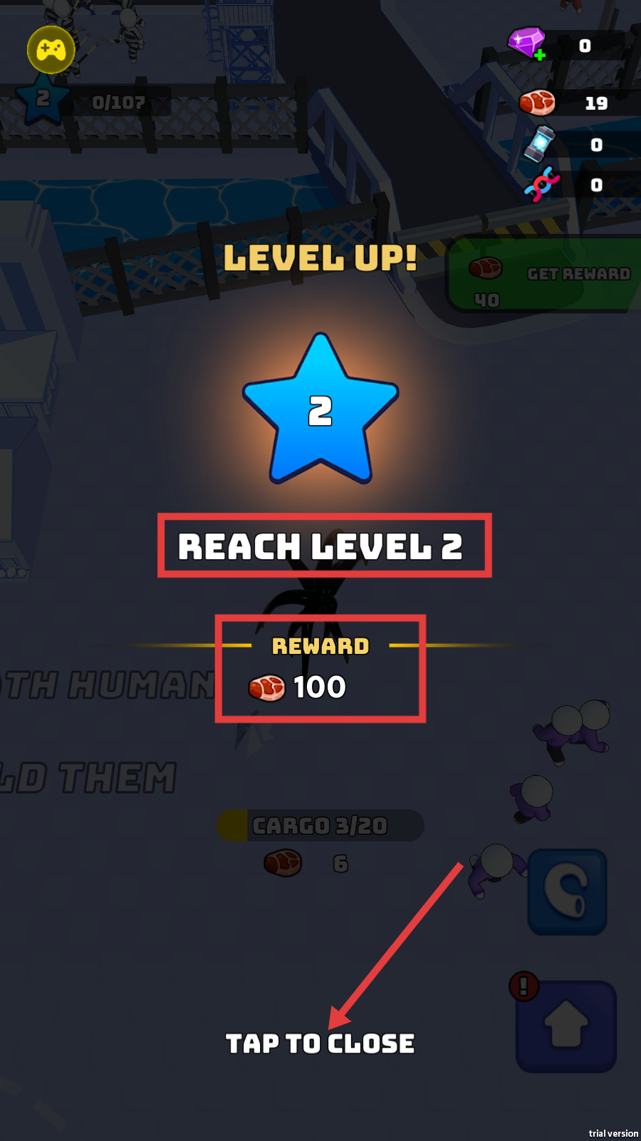 4、完成任务或积累足够进度会升级,如达到【LEVEL-2】,可获得【REWARD-100】肉块,点击【TAP-TO-CLOSE】继续游戏。