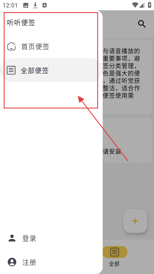 4、点左上角菜单,能选【首页便签】【全部便签】,快速切换查看,管理便签更轻松。