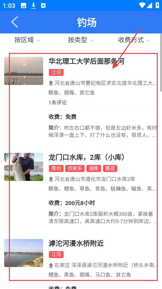 2、进入钓场页面,有【华北理工大学后面那条河】等钓点,选喜欢的,看详情,挑合适的去。