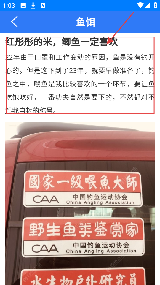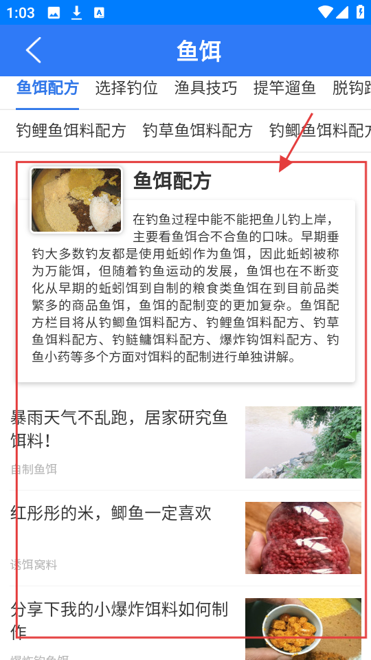 4、在鱼饵页面,看【红彤彤的米,鲫鱼一定喜欢】等分享,跟着学喂鱼技巧,让鱼更易上钩。