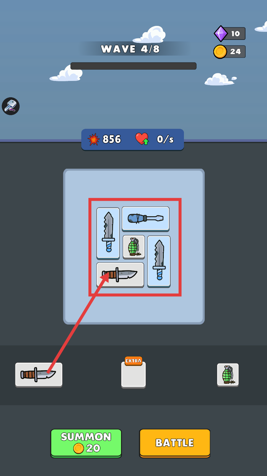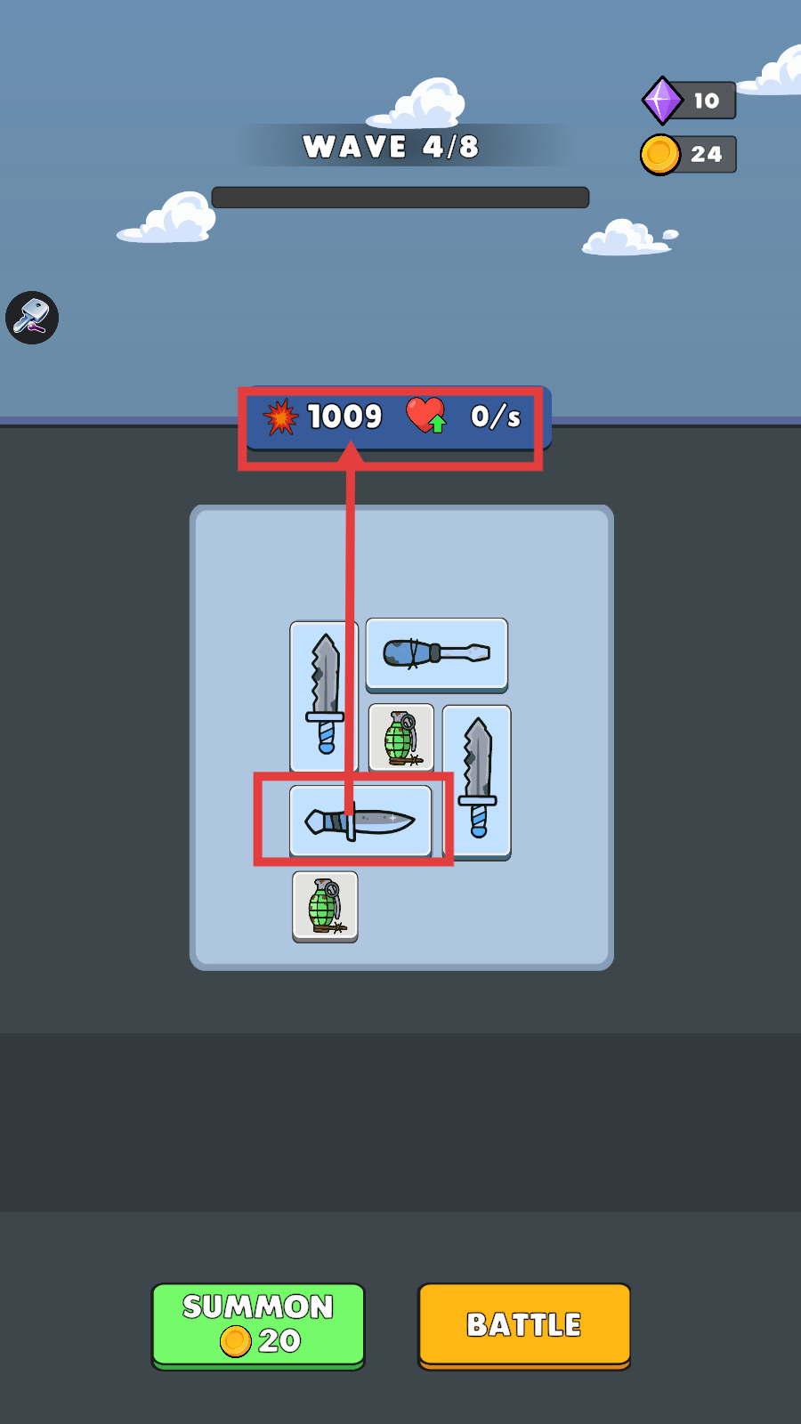 1、战斗前,将下方武器拖拽到上方格子进行合成,组合出更强武器,提升战斗能力。